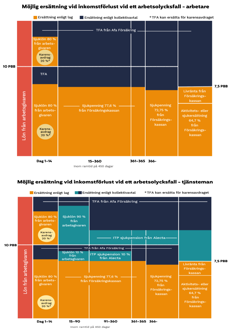 - För hela inkomstförlusten vid sjukskrivning som uppstår på grund av olycksfall i arbetet. Vid godkänd arbetsskada kan ersättning lämnas från första dagen i sjukskrivningsperioden.